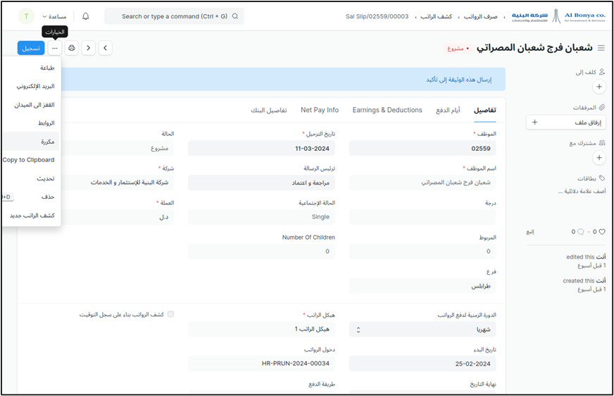 قم بفتح شريحة الراتب الخاصة بالموظف التي تم انشائها تلقائيا مع دورة المرتبات الحالية، اضغط على تكرار،