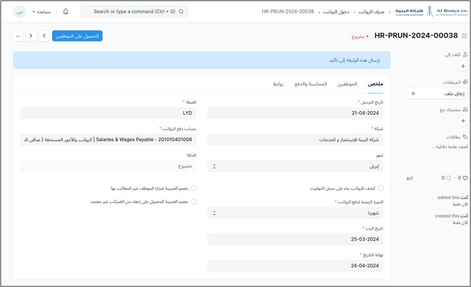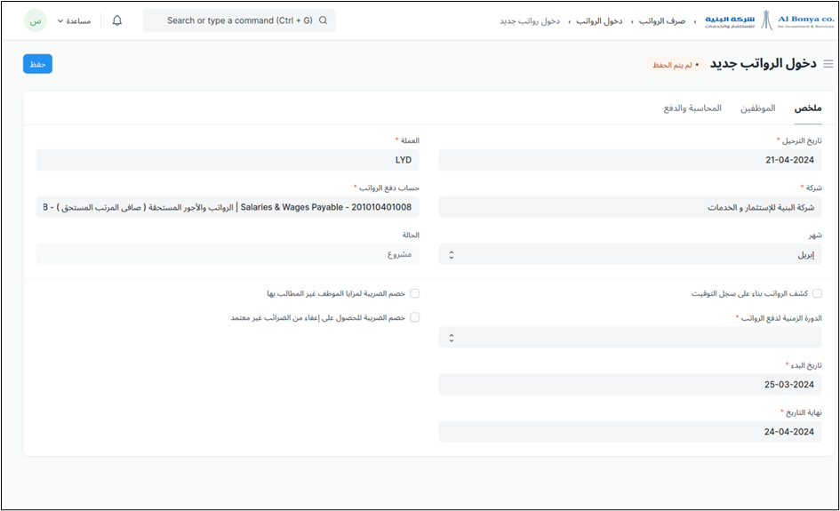 ملاحظة: إذا تم إنشاء قسائم الراتب بالفعل، فلن يقوم النظام بإنشاء المزيد من قسائم الراتب. يمكنك أيضًا حفظ النموذج كمسودة وإنشاء قسائم الراتب لاحقًا.