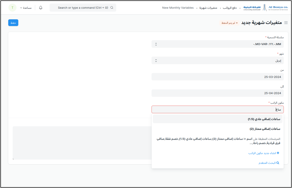 لإضافة سجلات ساعات العمل اﻹضافي للراتب واحتسابها، قم باستخدام نموذج المتغيرات الشهرية بختيار قيمة المتغير (ساعات عمل اضافي عادي\ ساعات عمل اضافي ممتاز)