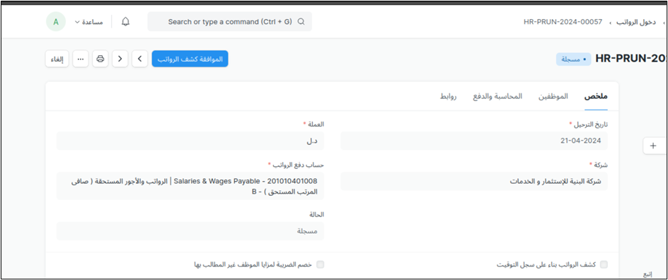 إدخال دفع الراتب هو إدخال دفتر يومية يقوم بخصم إجمالي مكون الراتب من نوع الأرباح ويضاف إجمالي مكون الراتب من نوع الاستقطاعات لجميع الموظفين إلى الحساب الافتراضي المعين على مستوى مكون الراتب لكل مكون.