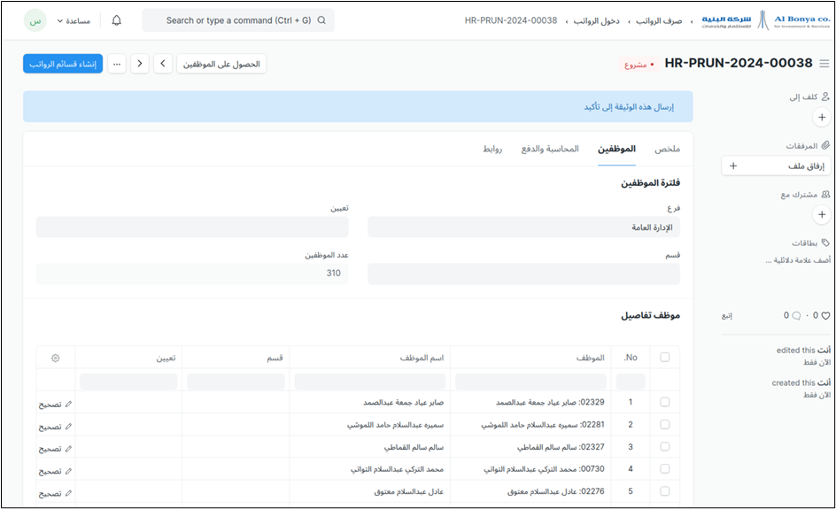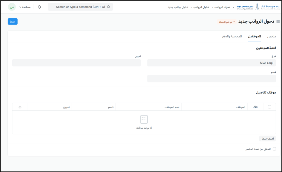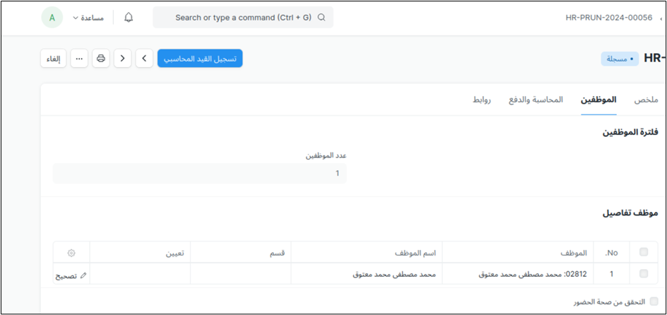 بمجرد حفظ المعلومات، انقر فوق الزر "الحصول على الموظفين" للحصول على قائمة بالموظفين الذين سيتم إنشاء قسائم الرواتب لهم بناءً على المعايير المحددة.
