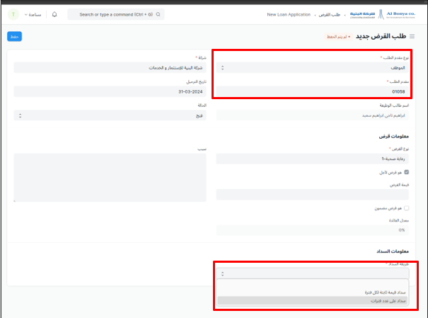 بمجرد الانتهاء من ذلك، يمكن للموظف التقدم بطلب للحصول على قرض. لتقديم طلب للحصول على قرض، قم بتعبئة نوع مقدم الطلب ومقدم الطلب ونوع القرض ومبلغ القرض وطريقة السداد.