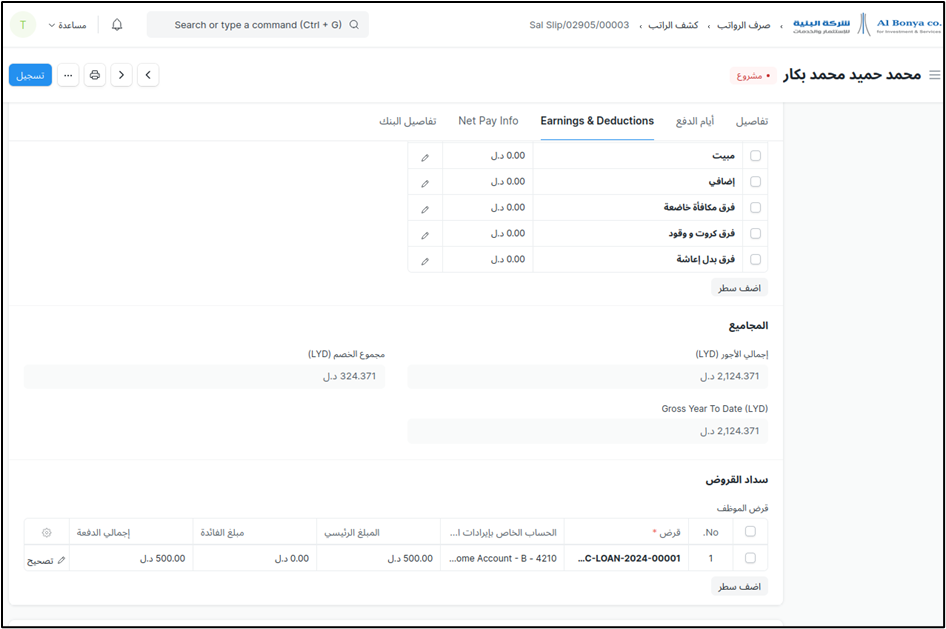 بعدها تلقائيا سيقوم النظام بخصم قيمة السلفة شهريا من كشف الراتب للموظف كما في التالي: