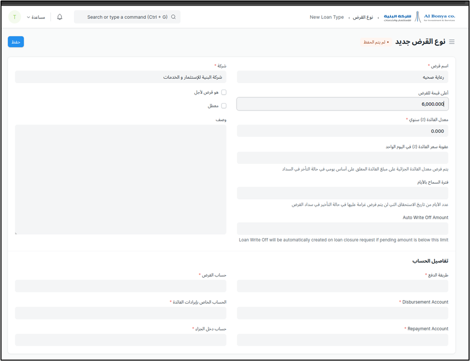 لهذا، تحتاج أولاً إلى إنشاء نوع القرض حيث تحتاج إلى ملء الحقول الإلزامية، مثل اسم القرض، وسعر الفائدة (٪) سنويًا. هنا يمكنك أيضًا تحديد الحد الأقصى لمبلغ القرض ووصفه إن وجد.