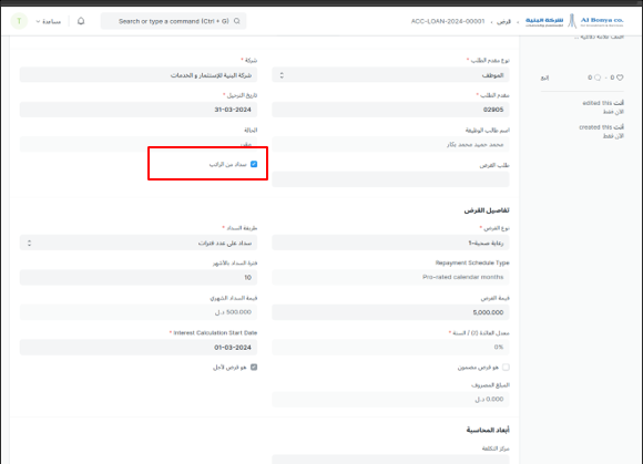 الآن، يحتاج الموافق على القرض إلى إنشاء قرض لطلب القرض المعني. يجب عليه/عليها ملء تاريخ بدء السداد، وطريقة الدفع، وحساب الدفع، وحساب القرض، وحساب دخل الفائدة، وبعض الحقول الإلزامية. في البداية، يتم فرض عقوبات على حالة القرض. توجد خانة اختيار "السداد من الراتب" والتي توفر للموظف خيار سداد مبلغ القرض من راتبه.