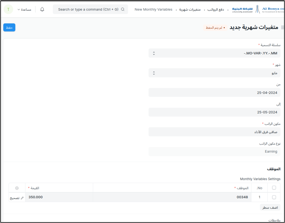 يتم فيه اختيار الشهر، والمتغير المراد ادخاله واختيار الموظفين والقيم أمامهم في الجدول الفرعي وبعد الإنتهاء منها قم بحفظ السجل وتسجيله نهائية لكي يتكون كمتغير في مرتبات الموظفين.